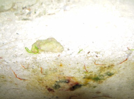 Cleaning sediment and organic material from the aquarium substrate is a controversial subject for some aquarists. It can be done by natural means or by manual removal. It is not recommended to disturb the sand bed too much, as the sediment released can cover the plants, rocks and other inhabitants. There are many beneficial invertebrates that can be added to a marine planted aquarium to aid in the cleaning and removal of organic material. An important aspect is to not overstock, as the “clean-up crew” will become counterproductive, often preying on each other. Various worms, copepods, amphipods, sea cucumbers, reef safe hermit crabs and snails will provide a natural way of keeping the substrate aerated, healthy and clean.