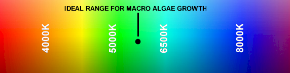 Light spectrum ratings are identified by the Kelvin temperature scale. The lower end of the Kelvin temperature range bulbs are most suitable for growing marine plants and are typically available in the 5000K – 6500K range. If your aquarium will include soft corals, most marine plants will also grow quite well under 10,000K lighting. This is normally a more pleasing spectrum to the eye, as the lower temperature bulbs can appear green or yellow. Unlike terrestrial plants which grow above the water or submerged at shallow depths, macro algae grow in different spectrums of light depending on the depth and species. Depending on the intensity and kelvin temperature the changes in color among different species can be quite dramatic. There are a few varieties of red macro algae for instance, that can be found in shades of red, yellow and brown within the same species. The distinct coloration is caused by the pigments associated which each species and the spectrum of available light it receives. Overall most macro algae and sea grass will do well under full spectrum lighting. The exception is with some varieties of red macro algae, which prefer a much bluer spectrum and can benefit from some supplemental actinic spectrums. Mixing color temperatures is preferred and is the most appealing while still allowing for optimum growth. Too much red spectrum can fuel the growth of less desirable algae both on the macroalgae and in the substrate.