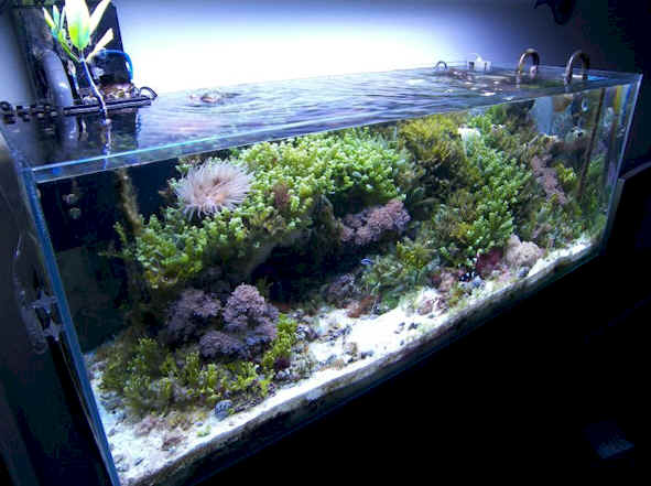 Control of both micro and macro algae growth is usually accomplished by limiting excess nutrients in the aquarium by using the correct spectrum bulbs and maintaining the temperature of a system. The turbidity of the aquarium environment will also affect growth in marine macro algae. Species that grow in protected habitats will not grow at the same rate or share the same characteristics if introduced to strong currents in the aquarium. This is evident with many species of Caulerpa, especially C. mexicana. It will remain short and compact in strong current, while growing tall and wide in a sheltered environment. Overall however, marine micro and macro algae are very resilient and will adapt to almost any artificial conditions including current, lighting, temp, salinity and ph. Another limiting factor of growth in marine algae in the aquarium is the competition for nutrients and sunlight between species. When conditions are favorable for rapid growth, eventually one species will try to dominate the landscape and “choke out” other species or colonies. This can be avoided by diligently pruning the aquascape so that no colony intrudes or outgrows its biomass or given space.