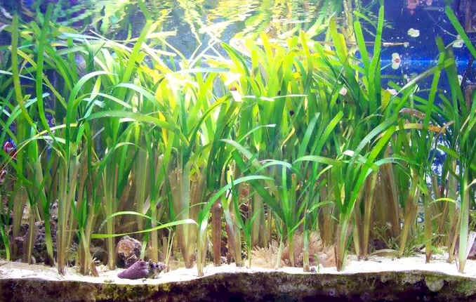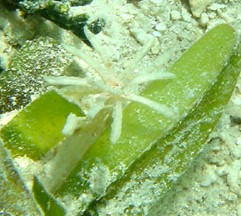 The marine flowering plants (angiosperms) reproduce by both sexual or asexual (vegetative) methods. In sexual reproduction, the plants produce flowers and transfer pollen from the male flower to the ovary of the female flower. Most sea grass species produce flowers of a single sex on each individual, so there are separate male and female plants. Some species only reproduce through vegetative means. Vegetative reproduction is a type of asexual reproduction for plants in which new plants are formed without the production of seeds or spores. In asexual reproduction, the new plants are formed by the rhizome which serves as an organ of vegetative reproduction. Shown to the left is a picture of a newly formed flower on a species of Thalassia. Flowering plants are rarely seen in the aquarium and are unlikely to reproduce by seed in captivity as conditions are not favorable. Most of the occurrences in the aquarium are from sea grasses collected just before the flowering stage.