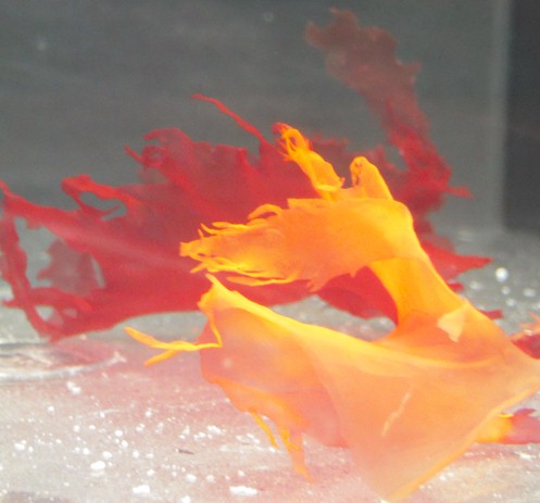 Reproduction helps assure each species’ survival in the ocean. Note the absence of any reproductive spores on the damaged frond in this species of Halymenia floresia (pictured above). Many aquarists mistake this orange coloration often seen on this species for new growth, but it is actually dying tissue. The drying out of cell tissue can induce the algae to produce and release reproductive spores and is used as a means of producing algae seed in the mass culture of commercial seaweeds.