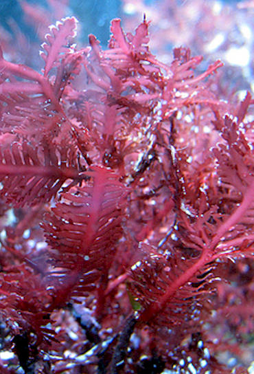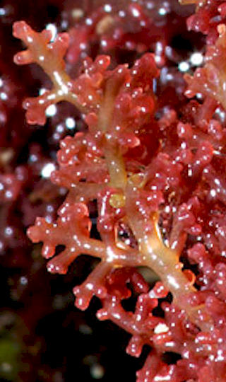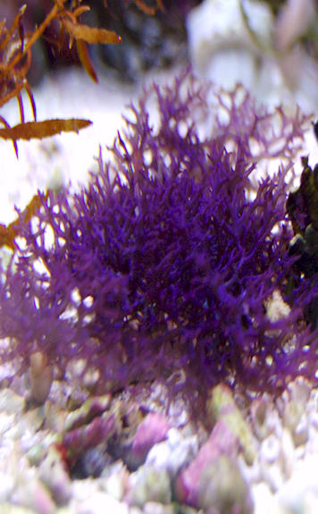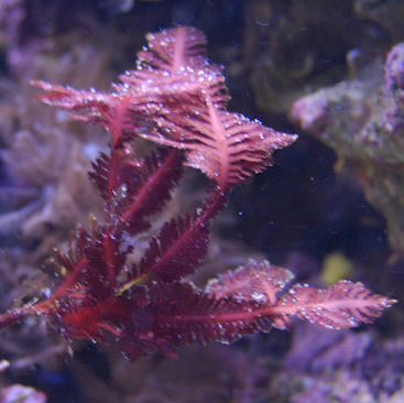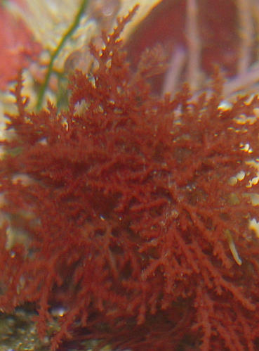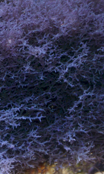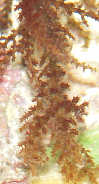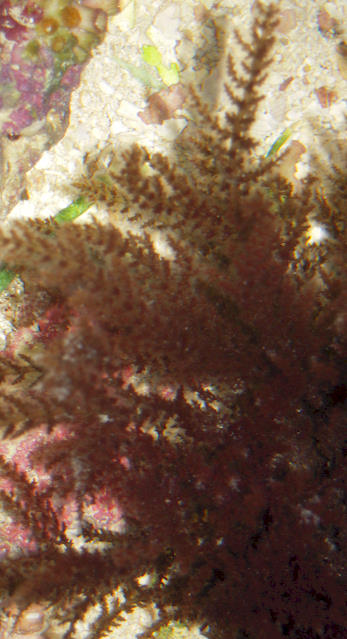 This interesting red macro algae is one of the only species that has a brown coloration. It features tall, irregular and stiff uprights composed of smaller, pointed branches. It is often confused with Laurencia as it has similar characteristics, but the branches of this species are much finer and more compact. This species has a single holdfast that attaches to rocks, shells and other hard bottom habitat, typically in shallow costal habitats with strong tidal surge. A fast grower, it can be invasive in reef aquariums so care must be taken to regularly prune each specimen. It’s collected in shallow water from the low tide zone to depths of about 10ft. If placed under strong lighting, it often has a brilliant white appearance.