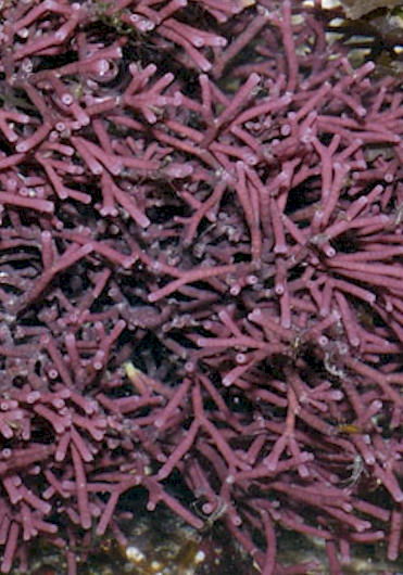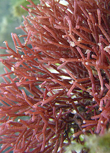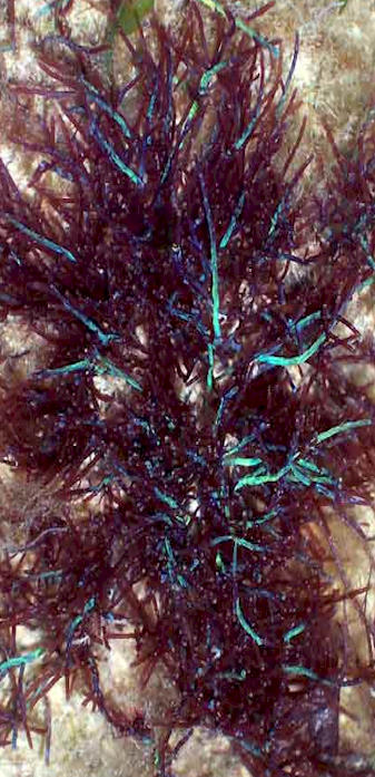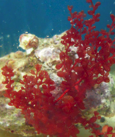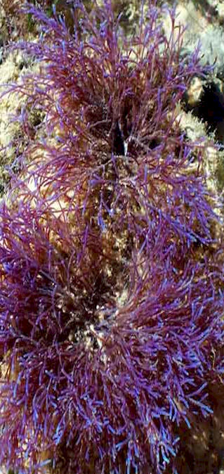 This species features attractive, flattened, flame shaped appendages with a coloration ranging from pink to dark red. Like all species of Halymenia, it’s very thin, gelatinous and smooth in texture and loses it’s form when removed from the water. It’s delicate and can break apart and tear easily when handled or subjected to high flow. It’s sometimes encountered as free floating specimens in seaweed mats, but it naturally grows attached to hard bottom in depths of up to 60ft or so. Single plants can grow very large and reach heights of almost 20″ or more. H. floresia requires a large amount of nutrients to keep successfully in the aquarium and moderate to high flow to maintain its slippery, fleshy blades. In the aquarium it will seldom attach to anything so specimens can be anchored or allowed to tumble free floating. It’s very palatable and is readily eaten by both tangs, angels and other herbivores.