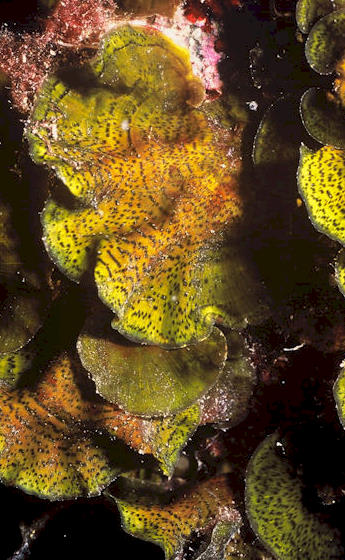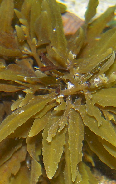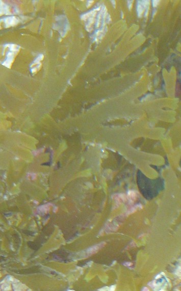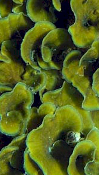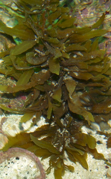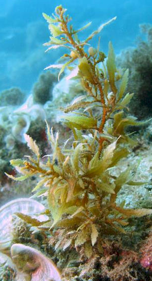 Species of the brown algae Sargassum are among the most prolific of all brown algae in the Caribbean. This particular species features serrated, gold-brown leaves that form from a series of thick, main branches. Air bladders are common on this species and help to keep the plant upright. Mature plants often reach heights of 30″ or more in deeper environments, but most are found in shallow water. Anchored varieties are most suitable for the marine aquarium and have a very sturdy holdfast that is able to securely anchor itself in very turbulent environments. In the aquarium they require bright lighting and moderate to high flow rates for optimal growth. A large plant, that needs to be pruned often. Not known to be very palatable to fish.