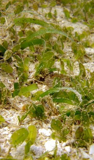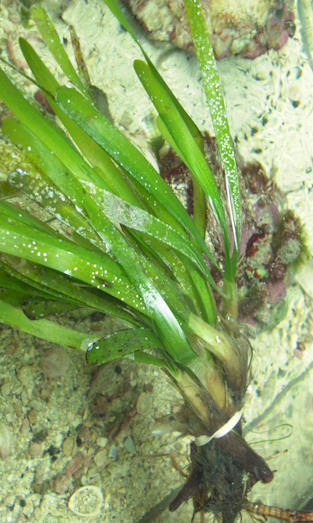Species of Thalassia are the most abundant marine plant in the Caribbean. A flat bladed, dark green sea grass featuring an extensive root system that securely anchors and protects the plants from tidal surge, storms and ocean currents. The leaves are ribbon-like, about ½ inch wide and often reach heights of up to 14 inches long. Turtle Grass, like most sea grasses, are very adaptable to survive in a wide range of salinities, ranging from 20 ppt. to 40 ppt. It can also survive exposure to air at low tide levels. Once the root system is disturbed or damaged it will not repair itself, which is why it can take a year or more for damaged beds to become restored. In the aquarium it requires a moderate depth of sediment (6-8″ minimum) for its deep rhizome network. The root system spreads by lateral growth of the rhizomes at their ends and is the most common form of reproduction. Sand beds that are rich in organic material are best, but plants can be fertilized by inorganic means such as dry and liquid plant food.