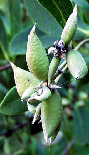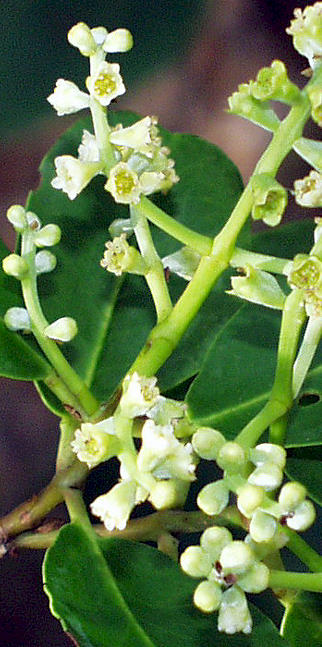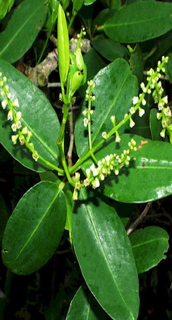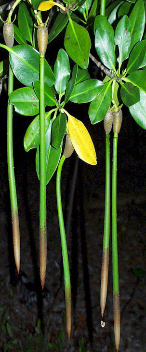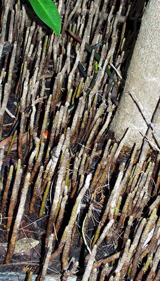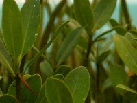 The white mangrove is usually found further inland of the red and black mangroves and is the most cold-sensitive of the mangroves. The white mangrove features a pair of nodular, salt-excreting glands found near the tip of each leaf stalk and a series of blackish glands between the middle vein. The seeds or fruit of the white mangrove are round and the flowers are white. One of the distinguishing characteristics are the rounded leaves that feature a notched tip. Unlike both red & black mangroves, white mangroves lack specialized aerial roots, though under certain conditions may produce a few “peg roots” similar to those of the black mangrove. Flowering is in spring and early summer. Because of the lack of breathing tubes or aerial roots, the white mangrove is difficult to grow in the marine aquarium. Some have had success with simply floating collected seed pods, but the plant normally dies as its roots can not be submersed long term. Its only suited for biotopes that allow for the root system to be partially above the water line.