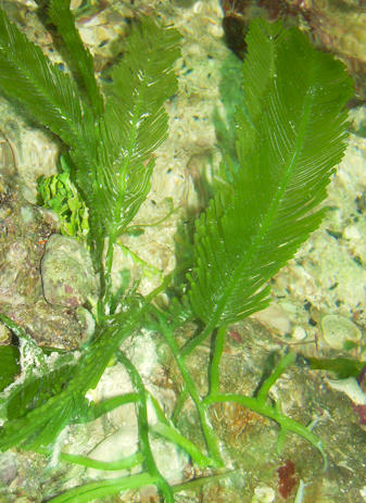 This species of Caulerpa is a large variety that can reach blade widths of up to 2″ and a height of about 12″. Unlike it’s close relative, Caulerpa sertulariodes, it prefers slightly deeper habitats and often is found on the edges of channels in depths of 20ft or more. It features a thick rhizome, split into individual cylindrical fronds that grows horizontally on the sea floor. Younger specimens are often confused with Sertulariodes, as they are very similar in characteristics and are often sold as “feather algae” in the aquarium trade. Because of its size and it’s fairly slow growth it will not overgrow its environment like other species do. When pruning the large rhizome, pinching the tissue is best so that a minimal amount of chemical is released into the aquarium. Regular division of the rhizome is recommended to promote new growth and to protect the algae from sporulation.