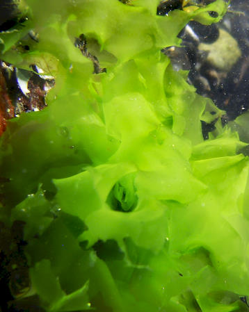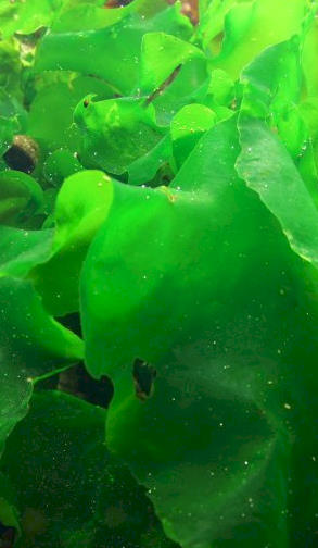Ulva is common worldwide in a wide variety of species and locations. It lives in both temperate and tropical waters seasonally and prefers water temps of 60-78 degrees. Most are composed of smooth, ruffled disks attached to rocks, shells or hard bottom by a single holdfast. Other forms include strips or tubes protruding from the center of the plant.  A fast grower, it’s use is nearly as popular in the refugium as Chaetomorpha. Not only does it efficiently remove excess nutrients from the aquarium, but it is very palatable to a number of fish and invertebrates. Ulva is also an excellent macro algae for culturing both copepods and amphipods in the aquarium. Although it will attach, typically Ulva is tumbled or allowed to simply float in a refugium. It can be problematic in a refugium if the return pump is not protected, as it can clog up plumbing systems. Very palatable to fish.